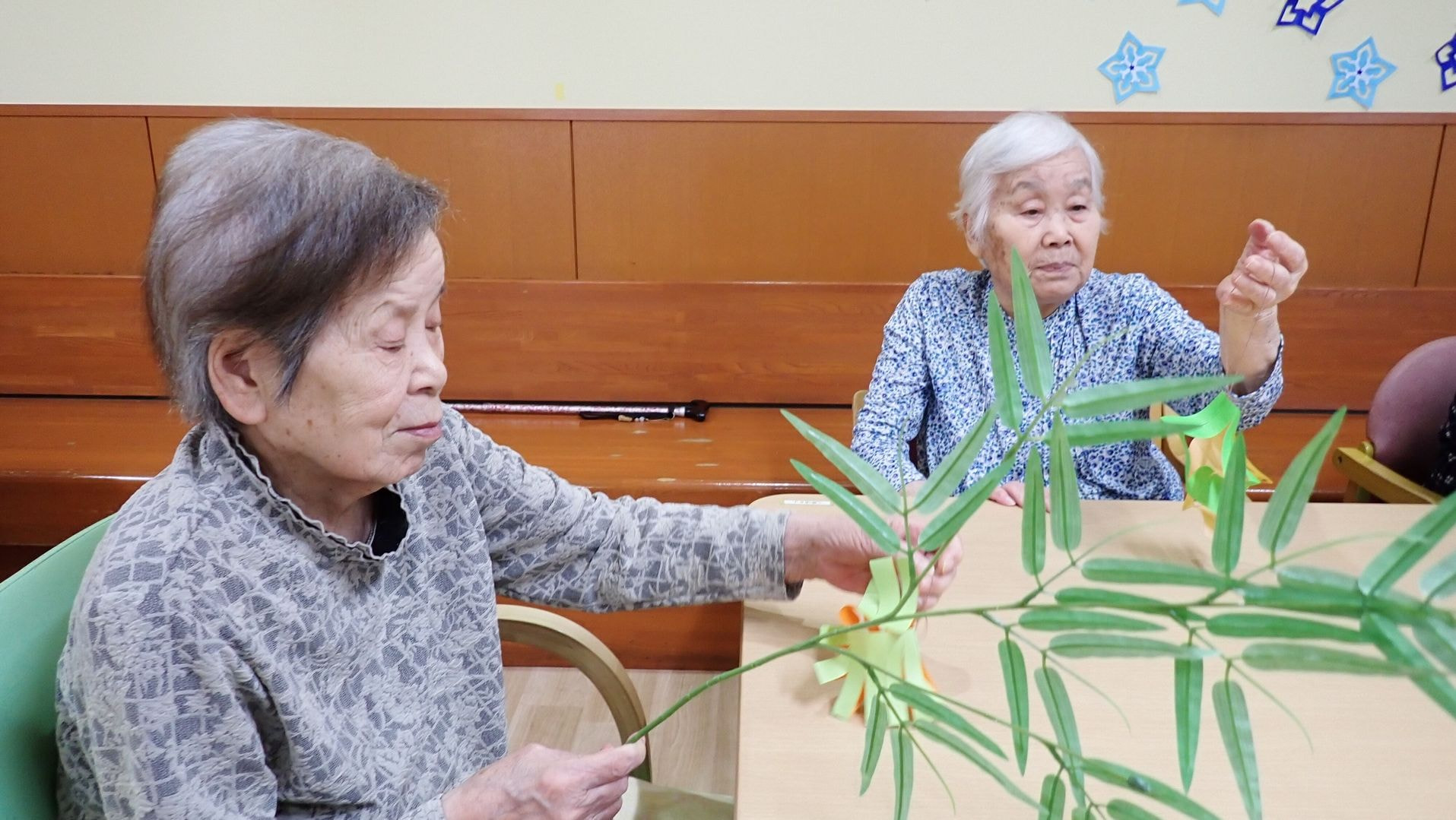 特別養護老人ホーム葺きの里では皆さまで短冊作りを行いました。今年も様々な願い事がみられました。健康に関すること、お金、ご家族の幸せや恋愛などなど♪